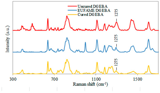 In Figure 6, the Raman spectra of uncured DGEBA, cured DGEBA and the cured EUFAME/DGEBA blend are shown. A decrease in peak intensity at 1275 cm−1 corresponding to the epoxide group was observed in EUFAME/DGEBA and cured DGEBA. The degree of crosslinking of the epoxide group and the EUFAME/DGEBA blend by Raman spectroscopy is 87.21%, comparable to 93.01% of neat epoxy resin (cured DGEBA).
