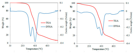 The thermal degradation rate of the EUFAME/DGEBA blend and neat epoxy are comparable, according to the DTGA curve in Figure 7a,b. A double peak corresponding to the maximum effect on the rate of degradation is found. The first peak degradation temperature (T1) appears at 369.56 °C and the second peak degradation temperature (T2) at 436.29 °C for the EUFAME/DGEBA blend, while in the neat epoxy, these occur at 360.66 °C and 433.22 °C, respectively.