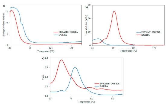 Variation in temperature of (a), storage modulus (b), loss modulus and (c) loss tangent (tan δ) of cured neat epoxy resin (DGEBA) and cured EUFAME/DGEBA blend.