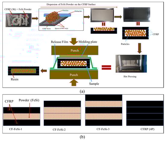 The CFRP sheets were laminated with the layers of FeSi powder, as illustrated in Figure 1. Figure 1a shows the manufacturing process of CFRP-particle composites and Figure 1b presents the lamination sequence of the composite specimens that were considered in this study. In fact, the CFRP prepregs were cut into rectangular sheets. Thereafter, in order to be able to control the thickness of the particle layer during the distribution of particles, small pieces (strips) of CFRP sheets were laminated on the four sides of the larger CFRP sheet prior to particle distribution. Those strips were used to act as spacer layers. As shown in Figure 1a, the dispersion of metallic particles was homogeneously done by sliding the metallic bar on the top of the powder (FeSi) at a height equal to the thickness of the spacer layer. The thickness of the spacer was considered to be equal to one layer or two layers of CFRP sheets. Then, on the top of the distributed particles, another layer of CFRP was added to form a sandwichlike structure. The CFRP layers were oriented in the same direction. The samples of 300 mm length and 160 mm width were considered. The upper surface and lower surface of the stack were covered with the release film so that the resin would not stick to the mold. The upper and bottom punch of the hot press were initially heated to a temperature of 140°C before placing the stacked composite. The stack of CFRP layers and metallic particle layers was then placed in the hot press (Blanket Press, Korea Composite Application (KCA), Gimhae, Korea). The sample was left in contact with the punches of the press for 1 min in order to let the resin flow and fill the gaps between the metallic particles. Then, a pressure of 14 MPa was applied and maintained for 1 h to allow the complete cure of the resin. The produced composite plates were machined into specimens for properties testing.