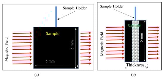 The magnetic properties of the composites, such as saturation magnetization and coercivity, were evaluated using VSM. The measurements were taken by considering the cases when magnetic field strength was applied either parallel (in 0° direction, in-plane) or perpendicular (in 90° direction, through-thickness) to the specimen as shown in Figure 3.