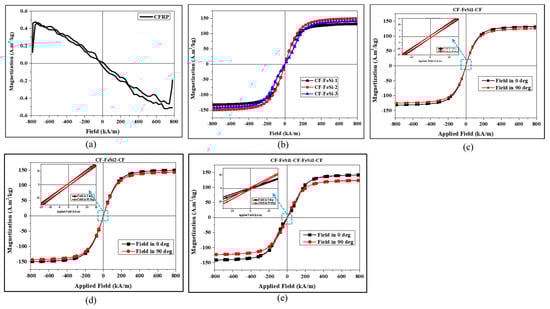 Figure 4 illustrates the hysteresis loops of the composites. The CFRP composite without magnetic particles exhibited diamagnetic behavior with a negative slope of the hysteresis loop, as shown in Figure 4a. On the contrary, the CFRP-FeSi composites showed the ferromagnetic behavior due to the ferromagnetic particles incorporated in epoxy resin. The saturation magnetization, coercivity and remanence of the materials are given in Table 3. Clearly, the composite CF-FeSi-2 (i.e., CFRP-FeSi2-CFRP) had the best saturation magnetization in all composites. In fact, by increasing the amount of particles in the composite with a limited number of CFRP plies, the magnetic powder-to-epoxy volume ratio was increased and the amount of epoxy to bind the particles was reduced. In addition, the more magnetic particles and less nonmagnetic epoxy were used, the less nonmagnetic space between magnetic particles was formed. This led to the creation of thinner layer around the magnetic particles which could reduce the magnetic reluctance of the composite and promote the transfer of the magnetic field from particle to particle. On the other hand, three plies of CFRP caused a very slight increase in coercivity of the composite. This increase in coercivity can be explained by the increase of impurities and nonmagnetic materials between the ferromagnetic particles as the number of CFRP plies increased. Figure 4b–d and Table 3 show that the saturation magnetization of the composites were generally higher when the composites were placed in parallel with the applied magnetic field (in-plane magnetic field, Figure 3a). For instance, the saturation magnetizations of CFRP-FeSi-2 were 149.63 A.m2/kg and 143.55 A.m2/kg for the magnetic field strength applied in the 0° direction (in-plane field) and 90° direction (through-thickness field), respectively. That difference in magnetic properties of the composites depending on the direction of the applied field can be attributed to the anisotropic design of the composites. In fact, when the magnetic field was applied in parallel to the sample width, there was a long magnetic path made of continuous FeSi–epoxy layers to carry the magnetic flux. This continuous long magnetic path was advantageous in the enhancement of saturation magnetization. However, when the magnetic field was applied perpendicular to the surface of the sample, there was a very short magnetic path. In addition, the magnetic field was generally interrupted by the nonmagnetic layers (CFRP layers) and, consequently, lower saturation magnetization was recorded. The results in Table 3 show that the orientation of the specimen with respect to applied magnetic field had no significant effect on the coercivity.