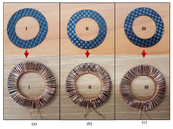 In order to obtain the permeability of the CFRP-FeSi core, inductors with toroid CFRP-FeSi cores were manufactured. For each CFRP-FeSi magnetic composite, an inductor consisted of a single composite sheet core with a winding of 110 turns of copper magnetic wire of 0.4 mm diameter, as shown in Figure 5. The inductance, impedance and quality factor of the inductors were recorded by considering the series circuit model of the LCR meter [38]. The measurement results, in Figure 6a, indicate that the composite CF-FeSi-2 had the best inductance among the CFPR-FeSi magnetic composites. The maximum inductances were 6.92 µH, 12.2 µH, and 11.6 µH for the composites CF-FeSi-1, CF-FeSi-2 and CF-FeSi-3, respectively. It can be seen that the increase in the volume content of magnetic particles within the composites has contributed to the improvement of the inductance. The effective permeability (µeff) of the each core was calculated from the inductance data by using the following equation [39,40].