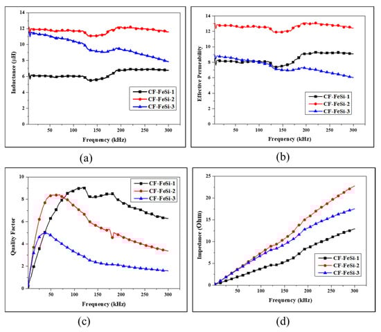 The continuous increment of the impedance of inductors made with CFRP-FeSi composites when the frequency rose, as shown in Figure 6d. This can be explained by the significant increase in alternative current (AC) resistance of the core and windings as the frequency increases, especially below the self-resonant frequency of the inductor [48,50,52]. The results in Figure 6d indicate that the inductors with a composite core exhibited inductive characteristics in the frequency range of 1 kHz to 300 kHz [52].