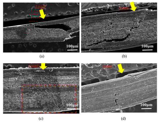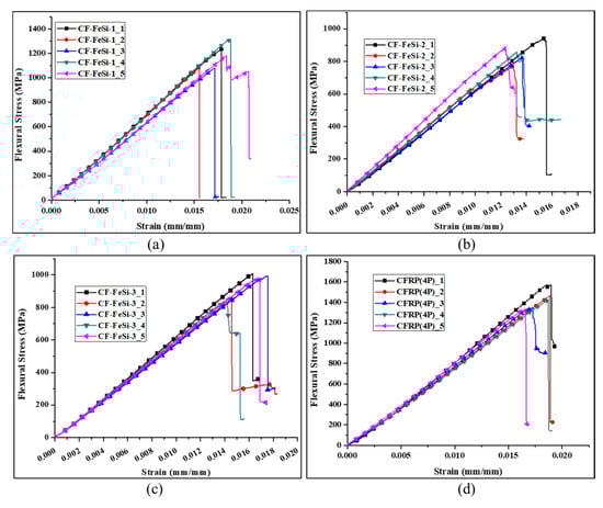 Figure 8 shows the fracture behavior of composites after the bending test. The fractography images, in Figure 8, show that the crack propagation in CFRP-FeSi composites was inclined to certain angle with respect to the applied load whereas it has almost the same direction in the case of the CFRP (4P) composite. The crack propagation was obviously not critical in the CF-FeSi-3 sample in comparison with other CFRP-FeSi composites due to the high-strength layer of carbon fibers between the powder layers. This can be attributed to high-strength CFRP layers in the midplane of the CF-FeSi-3 sample.