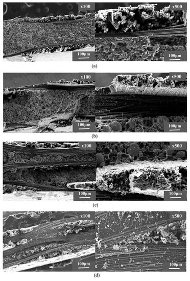 The morphology of the composites was examined on the polished cross-section of the composites using SEM and the images are shown in Figure 2. It can be seen from SEM images that the epoxy resins have penetrated among the particles to insure the bonding between particles. As a result, the epoxy resins played the role of the matrix for both the carbon fibers and the particles. However, some porosities were observed inside the composites. This can be associated with either the rapid curing of the resin before its complete penetration among the particles or with lower compacting pressure, which was limited by the capacity of the hot press machine. The SEM images, in Figure 2b–d, show that the particles have kept almost their original forms, without significant deformations due to the low compacting pressure.