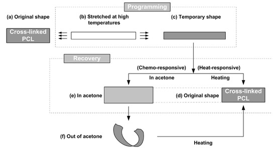 - Zhu, G.M.; Xu, S.G.; Wang, J.H.; Zhang, L.B. Shape memory behaviour of radiation-crosslinked PCL/PMVS blends. Radiat. Phys. Chem. 2006, 75, 443–448. [Google Scholar] [CrossRef]