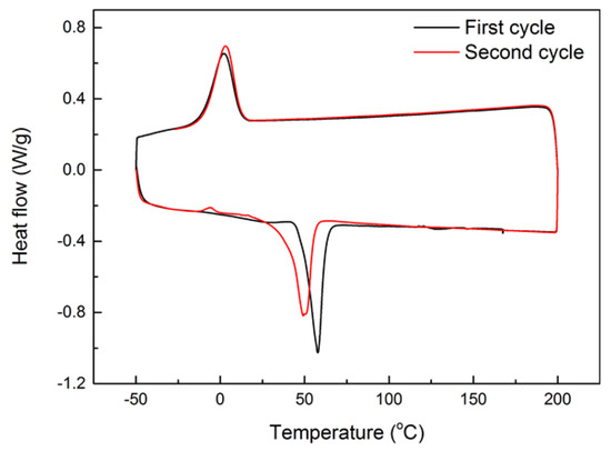 Differential scanning calorimetry (DSC) test was carried out on a piece of small original pellet for two continuous thermal cycles between −50 °C and 200 °C at a temperature ramping rate of 10 °C/min using a Q200 DSC machine (TA Instrument, New Castle, DE, USA). According to the result of the second cycle (red line in Figure 2), the melting temperature (Tm) of this material is about 50 °C, and at around 60 °C it fully melts. Upon cooling, its crystallization temperature (Tc) is found to be about 0 °C. However, after 15 min at room temperature (about 23 °C), which according to Figure 2, is slightly above the crystallization starting temperature of this material, it is able to fully crystallize. An additional DSC test carried out between −100 °C and 200 °C (Figure S4 in the Supplementary Materials, Part I) reveals that the glass transition temperature range of this material is between −50 °C and −30 °C.