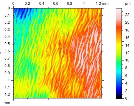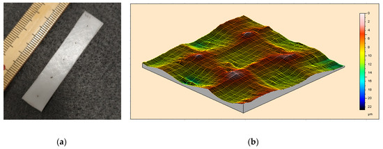 Flat pieces with a thickness of 1 mm or 0.3 mm were prepared via hot-compressing at 130 °C. It was observed that at 110 °C, this polymer is already very easy to flow (refer to Figure 5). Hence, unless otherwise stated, the applied pressure was always very small in all hot-compression tests reported here. Samples were cut from the hot-compressed pieces into the required size for testing. Polytetrafluoroethylene (PTFE) thin film was used as the interfacial layer between the polymer and the metallic mold to ensure easy separation after hot-compression. Consequently, the textile pattern of the PTFE film was recorded on the surface of the hot-compressed samples as shown in Figure 3a, which is a strip-shaped sample cut from the hot-compressed piece. A few dots were marked on the sample surface for the purpose of manual measurement of the real deformation during thermo-mechanical testing. Figure 3b reveals the 3D surface over an area of 1 mm × 1 mm scanned by Talyscan 150 (Taylor Hobson, Warrenville, IL, USA), in which the fluctuation in height of the surface of the hot-compressed sample is around 20 μm. Samples were cut from the hot-compressed pieces into the required size for testing.