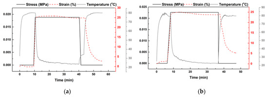 The heating-responsive shape memory performance of the samples with/without acetone treatment was characterized via DMA. In each test, the 1-mm thick sample was heated to a prescribed temperature. After three minutes of temperature stabilization, the sample was stretched to about 25% strain at a strain rate about 0.2%/s. After cooling back to room temperature, the sample was unloaded. This ends the programming process, which is the first part of a full shape memory cycle. Technically speaking, this heating temperature is called the programming temperature (Td) and the maximum deformation strain applied here is called the maximum programming strain (εm) [36]. In the next part of a full shape memory cycle, which is the recovery process, the programmed sample was heated to the previous programming temperature (Td) for shape recovery. Two typical DMA results, in which Td was 80 °C in both tests, but one sample was acetone treated and the other was without acetone treatment, are presented in Figure 6. Since the horizontal axis is time, the stress, strain, and temperature during each shape memory cycle are presented as a function of time.