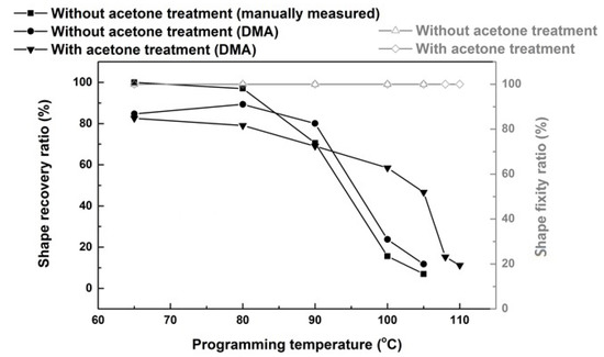 Shape fixity ratio (Rf) and shape recovery ratio (Rr) as a function of programming temperature (Td) for samples with/without acetone treatment.