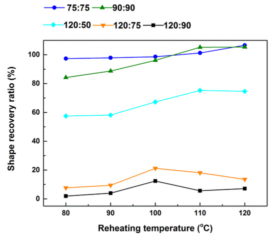 - Heat the sample in a step-by-step manner to five reheating temperatures (Tr) from 80 °C, 90 °C, 100 °C, 110 °C, to finally 120 °C. The corresponding shape recovery ratios after each heating are plotted in Figure 8. Legend in Figure 8 is in (Tp:Td) format to indicate the actual thermal history before final step-by-step heating of a sample.