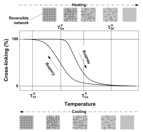 Schematic sketch of cross-linking (in %) versus temperature relationship upon heating (network eliminating) and cooling (gradual cross-linking).