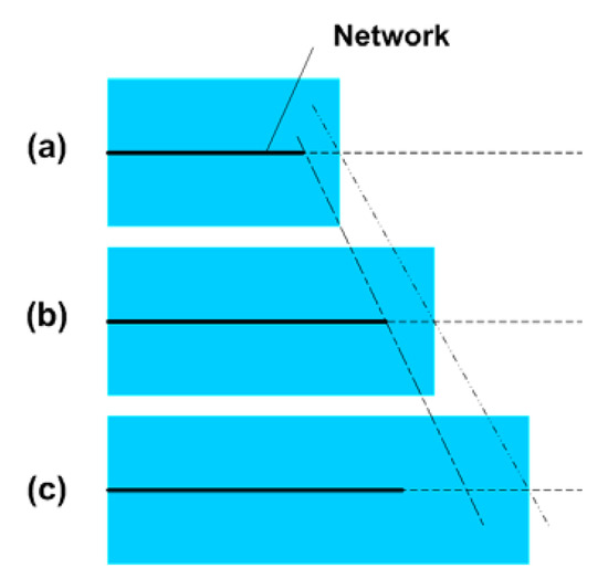 Schematic illustration of dislocation at the end of a network due to over-stretching. (a) Original (without stretching); (b) stretched within elastic limit; (c) over-stretched, dislocation which is permanent, occurs at the end of the network (the network is less extended).