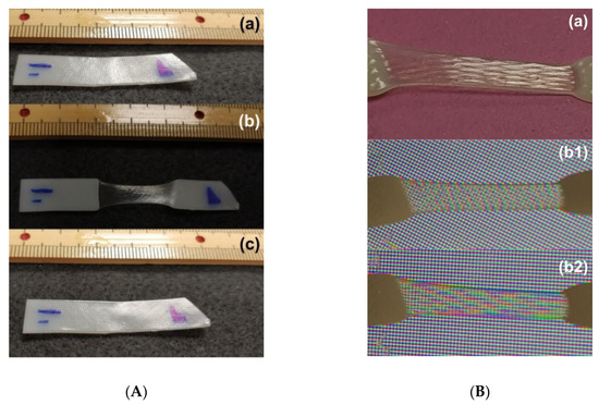 (A) Evolution of surface morphology in hot-compressed sample (1-mm thick) used in this study (refer to Section 2) in one shape memory cycle. (a) Original (opaque); (b) after stretching the middle part (transparent) of the preheated sample at room temperature; (c) after heating for shape recovery and cooling for crystallization at room temperature (opaque). (B) Coloring effect (light interference) in the middle-stretched area (transparent). (a) After stretching at room temperature; (b1,b2): sample with two different angles before LED computer monitor.