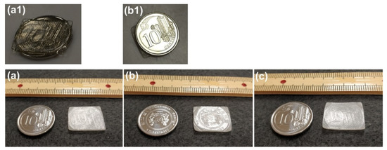 An example to superimpose a new permanent surface pattern (using a coin) atop the existing one (produced during sample preparation via hot-compressing as shown in Figure 3) is demonstrated in Figure 12, in which the first impression is done upon heating to around 100 °C (Figure 12(a1)), and the second impression is done after the pre-heated sample (to less than 80 °C) is just cooled back to room temperature (Figure 12(b1)). While the first impression (the mirror image of one side of a coin) is superimposed on the original permanent surface pattern produced during hot-compression (Figure 12a), the second impression (the mirror image of the other side of the coin) is temporary (Figure 12b), and can be fully removed after heating again (Figure 12c). Note that the maximum depth of the surface feature of a standard bank coin is about 0.1 mm [43,44], which is a lot more than that of the surface pattern of the hot-compressed sample (about 20 μm, refer to Figure 3b).