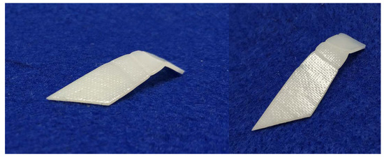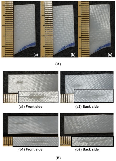Based on the characterized properties of the vitrimer-like SMP reported in Section 2, we can select an optimized temperature to heat the whole piece of a sample for healing within a short period of time, while the sample keeps the original shape/dimension. Two 1-mm thick examples as reported in Section 2 are demonstrated in Figure 13, in which Figure 13A is healing of surface cutting produced by a sharp blade via immersing into 90 °C hot water, and Figure 13B is healing of throughout thickness cutting produced by a pen-knife via heating using a hairdryer. According to Figure 2 and Figure 4, heating to 80 °C triggers the heating-responsive SME, which helps to close the cutting (shape recovery). Upon further heating to below its easy to flow temperature and then cooling back enables the network to be re-established, while the original surface pattern largely remains. The reversible network in vitrimer-like SMPs provides a temperature winder (between about 90 °C to about 100 °C for the material investigated in Section 2) to simultaneously achieve shape recovery and strength recovery with minimum impact on the original shape/dimension of the sample.