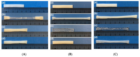 Typical SME tests programmed at three different temperatures. (A) Room temperature programming. (a) Original shape (opaque); (b) after stretching at room temperature (the middle part is transparent); (c) after heating to 80 °C (opaque); (d) after heating to 100 °C (opaque). (B) Programmed at 65 °C. (a) Original shape (opaque); (b) after programming at 65 °C (opaque); (c) upon heating to 65 °C for shape recovery (transparent); (d) after fully crystallized at room temperature (opaque). (C) Programmed at 95 °C. (a) Original shape; (b) after programming at 95 °C (opaque); (c) upon heating to 95 °C for shape recovery (transparent); (d) after cooling back to room temperature for crystallization (opaque).