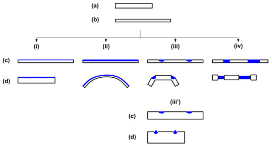 Illustration of typical approaches applicable for reshaping of vitrimer-like SMP strip (side view for all sketches) via gradient preheating and then heating for shape recovery. (a) Original shape; (b) after stretching; (c) after gradient heating; (d) after heating for shape recovery. (i) Wrinkling; (ii) bending; (iii) folding (local non-through thickness heating); (iii′) surface patterning (local surface heating); (iv) transition from uniform thickness to non-uniform thickness (local through thickness heating).