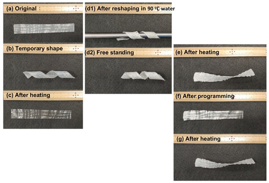 A combination of the vitrimer-like behavior and SME enables many new ways to manipulate polymers, far beyond folding/unfolding, reprocessing and heating assisted healing, which have been focused on in most of the studies reported so far [21,25,26]. In this section, in addition to these well-known applications, we explore some more possibilities in reshaping (inside/outside, microscopically/macroscopically, permanent/temporary) and manufacturing using vitrimer-like SMPs and their composites. Above characterized commercial vitrimer-like SMP is used to demonstrate all applications reported in Section 3.1, Section 3.2, Section 3.3, Section 3.4.