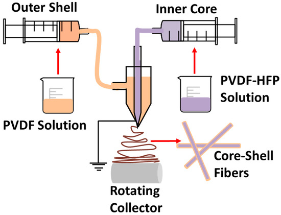 The PVDF and PVDF-HFP nanocomposites containing ZnO and TiO2 nanomaterials were synthesized by a coaxial electrospinning process, as schematically represented in Figure 1. For this, separate dispersions of PVDF and PVDF-HFP were made by dissolving 2 g pellets of the polymer in 15 mL solvent mixture of DMF and Acetone (1:1). The polymers were dissolved by the magnetic stirring process for 2 h at 70 °C. Both nanomaterials (TiO2 and ZnO) were separately dissolved in 5 mL of the same solvent mixture by ultrasonication for 60 min. Later, these dispersions were added to the respective polymer solutions to generate various nanocomposite solutions of PVDF and PVDF-HFP. Coaxial electrospinning follows the same principle of electrospinning (Taylor Cone formation with applied voltage and thereafter fiber formation), but two solutions are fed to the needle through outer and inner tubes [27,28]. These inner and outer solutions are represented as core and shell polymers that are, respectively, fixed as PVDF-HFP and PVDF. The nanomaterials, ZnO and TiO2, are added to the polymers in such a way to generate samples as shown in Table 1, and the hybrid effects of nanomaterials are investigated by reinforcing both polymers with nanomaterials.