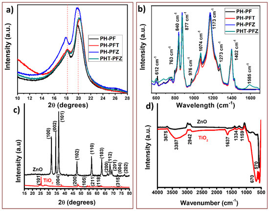 XRD patterns and FTIR spectra of (a) the PVDF-HFP/PVDF composites and (b) the nanomaterials, (c,d) respectively show the XRD and FTIR spectra of ZnO and TiO2.