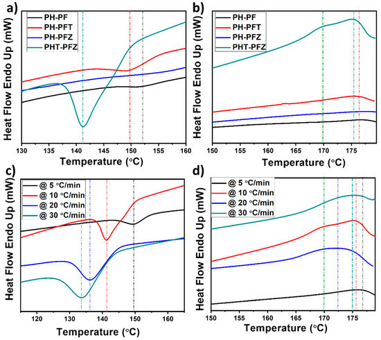 Differential scanning calorimeter (DSC) curves for the coaxial electrospun fibers (a) endothermic and (b) exothermic heat flow curves for the nanocomposites (c,d) heat flow behavior of the hybrid PHT-PFZ composite at different heating/cooling rates.