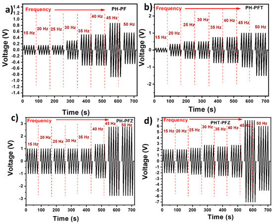 Piezoelectric output voltages for the coaxial electrospun fibers (a) PH-PF (b) PH-PFT (c) PH-PFZ and (d) PHT-PFZ.