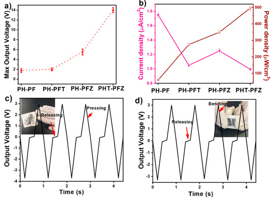 (a) Maximum peak to peak output voltage (b) current density and power density; voltage responses of the samples to (c) hand pressing and (d) bending motions (inset shows PHT-PFZ fibers with conducting wires attached on both sides).