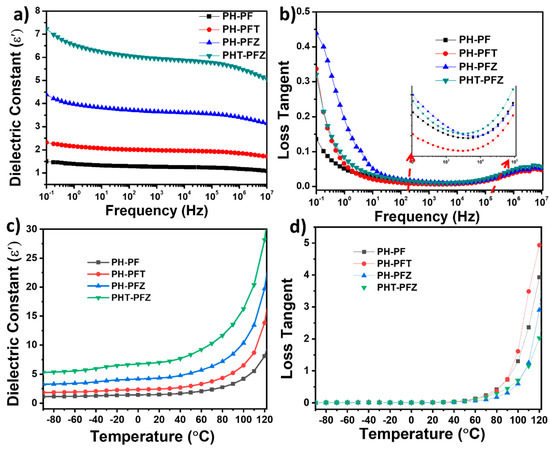 Variation of tan δ with frequency in Figure 8b further reveals the polarization effects within the nanocomposite fibers. The inset graph highlights the V-shaped curves for tan δ versus frequency. The dielectric loss mainly includes the conductance loss and polarization loss, respectively, at the 104 and 104–106 frequencies. While the conductance loss decreases with frequency at lower frequencies, the change in electric field and the corresponding hysteresis generates polarization loss at higher frequencies. This is the reason for the V-shaped curves of tan δ versus frequency plot [47]. The significant reduction in dielectric loss for the PH-PFT composite can be due to the interactions of TiO2 with the –CH2 groups of PVDF, which hinders the flipping of dielectric constant. However, for the composite fibers containing the ZnO, equal distribution of nanomaterials generates networking influence and creates a well-distributed fiber structure. The frequency at which lowest tan δ value is observed is the relaxation time. From the inset of Figure 8b, it is clear that the relaxation time decreases for the PHT-PFZ when compared to the neat polymer. This correlates with the networking structure as the polymer chains are restricted for movement when finely distributed particles exist in nanocomposites.