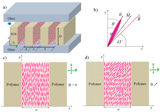 As shown in our previous work, a tunable optical diffraction grating can be constructed by introducing a mixture of liquid crystalline material and ferromagnetic nanoplatelets into a periodic scaffold of parallel polymeric ribbons, where polymer ribbons are made beforehand from a negative photoresist material (SU-8 polymer materials). The periodic scaffold was fabricated by the direct laser inscription (DLW) method (Figure 1a) [42,43,44,45]. ITO-coated glass plates, that had no additional surface treatment, support the grating structure from the bottom and the top sides and the entire assembly is glued together at the edges. The main parameters that define the optical properties of the resulting grating are the grating period Λ, the width of the polymer ribbons d (w = Λ − d is the gap between two adjacent ribbons), and the height of the ribbons D. The values of Λ and d depend on the DLW procedure, while the value of D is determined by the thickness of the initial spin-cast polymer film.