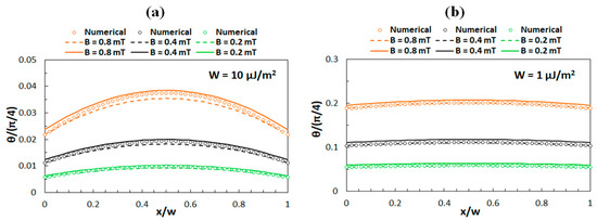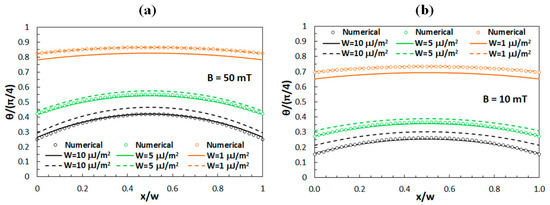 Consequently, the behavior associated with the limit of low magnetic fields was investigated for B < 1 mT. Figure 3 shows a comparison of the numerical results with the analytical results, where it can be noticed that for W = 10 μJ/m2 (Figure 3a) the analytical results obtained by Equations (9) and (13) both exhibit a slight deviation from the numerical results, while for W = 1 μJ/m2 (Figure 3b) the agreement is better.
