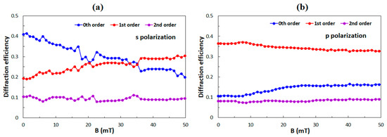 Experimental data of diffraction efficiencies of the 0th, 1st, and 2nd diffraction orders as a function of the applied external magnetic field for (a) the s-polarized and (b) for the p-polarized incident beam.