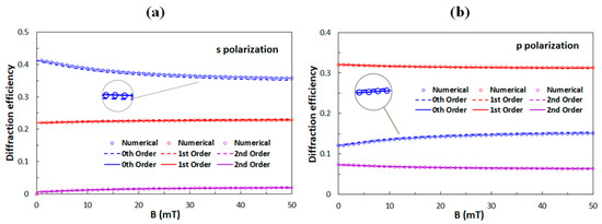 Diffraction efficiencies of the 0th, 1st, and 2nd diffraction orders as a function of the applied external magnetic field for (a) the s-polarized and (b) for the p-polarized incident beam. The anchoring strength is W = 1 μJ/m2. Circles are obtained with the numerical solution for θ(x), while solid lines are results for θ(x) obtained by Equation (9) and dashed lines for θ(x) obtained by Equation (10).