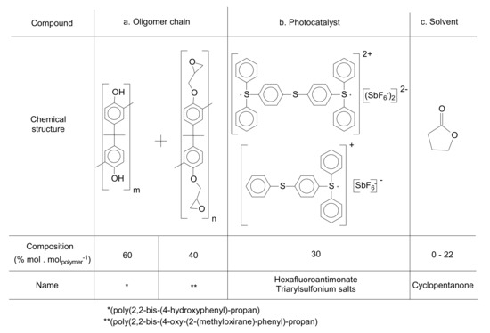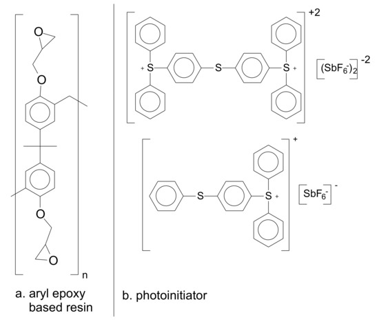 - Vlnieska, V.; Mikhaylov, A.; Zakharova, M.; Blasco, E.; Kunka, D. Epoxy Resins for Negative Tone Photoresists. Polymers 2019, 11, 1457. [Google Scholar] [CrossRef]