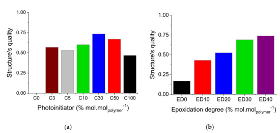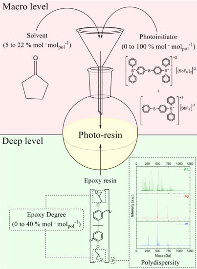 - For structures under 50 µm it is necessary to consider a specific polydispersion profile of the photo-resin to achieve better quality in the structures (deep level of properties). It is also suggested to restrict the concentrations for the epoxidation degree (deep level of properties), and photoinitiator (macro level of properties).
