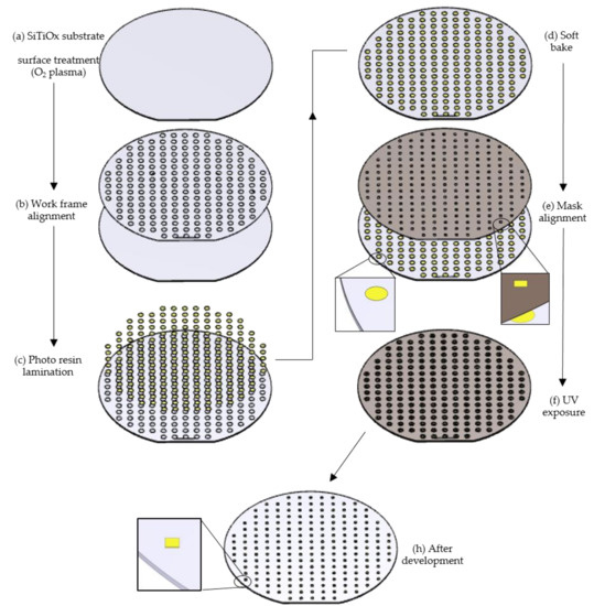 - O’Brien, J.; Hughes, P.J.; Brunet, M.; O’Neill, B.; Alderman, J.; Lane, B.; O’Riordan, A.; O’Driscoll, C. Advanced photoresist technologies for microsystems. J. Micromech. Microeng. 2001, 11, 353. [Google Scholar] [CrossRef]