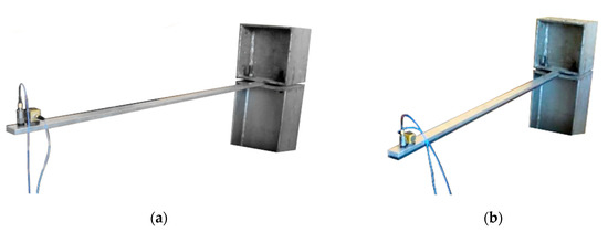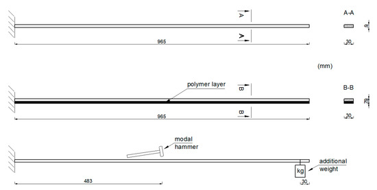 The first stage of the investigation was devoted to the analysis of two aluminium cantilever beams with a total length of 965 mm, a width of 30 mm and a height of 9 mm. One of them represents a plain cantilever beam (see Figure 1a), while the second one considers a beam with a polymer layer applied in the form of tape of the same width as the beam, with a total thickness of 7 mm, located on the bottom of the beam (see Figure 1b).