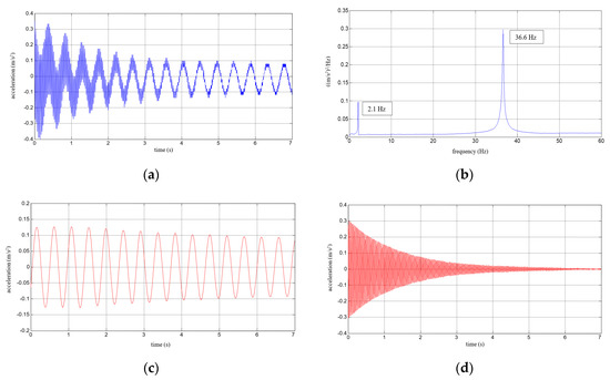 Results for an aluminium cantilever beam: (a) acceleration time history; (b) Fourier Spectrum; (c) vibrations with the 1st natural frequency; (d) vibrations with the 2nd natural frequency.