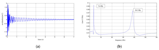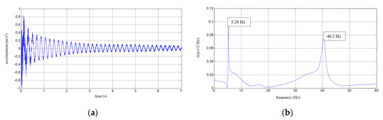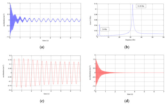 Results for a composite aluminium cantilever beam with 5 mm thick polymer adhesive: (a) acceleration time history; (b) Fourier Spectrum; (c) vibrations with the 1st natural frequency; (d) vibrations with the 2nd natural frequency.