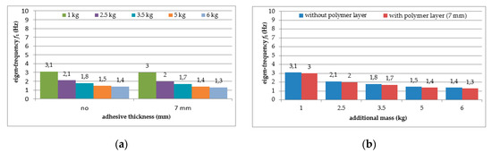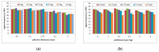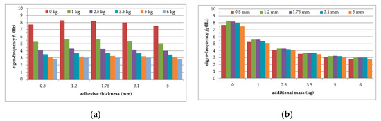 Comparison of first natural frequency values in relation to: (a) polymer adhesive thickness; (b) loading mass change.