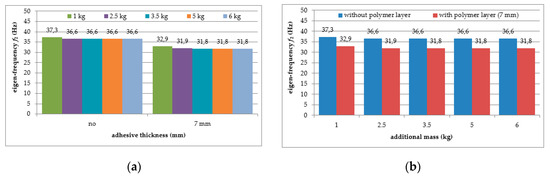 Comparison of first natural frequency values in relation to: (a) loading mass change; (b) presence of polymer layer.