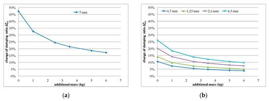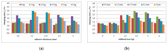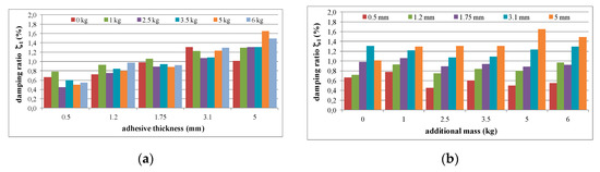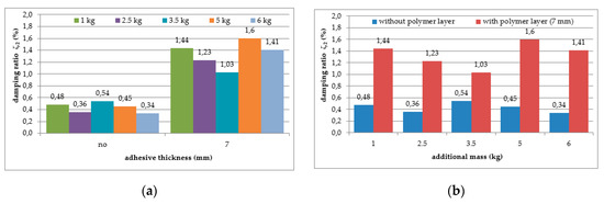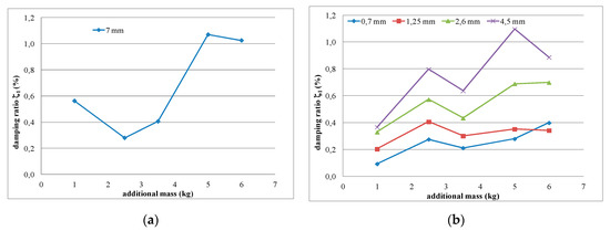 As can be seen from Table 4, a small, almost regular increasing trend (up to 1.5%) could be observed in the damping ratio of the analysed aluminium cantilever beams for the first natural frequency as a result of the changes in polymer layer thickness—see Figure 17a. Irregular increases and decreases were observed as a result of additional mass changes—see Figure 17b. The damping ratio determined for the second natural frequency was strongly irregular, and no clear relation could be observed with the increase in mass of the additional weights and the changes in the thickness of the polymer layer—see Figure 18.