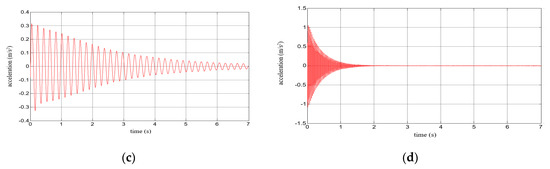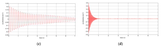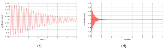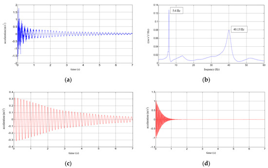 Results for a composite aluminium cantilever beam with 0.5 mm thick polymer adhesive: (a) acceleration time history; (b) Fourier Spectrum; (c) vibrations with the 1st natural frequency; (d) vibrations with the 2nd natural frequency.