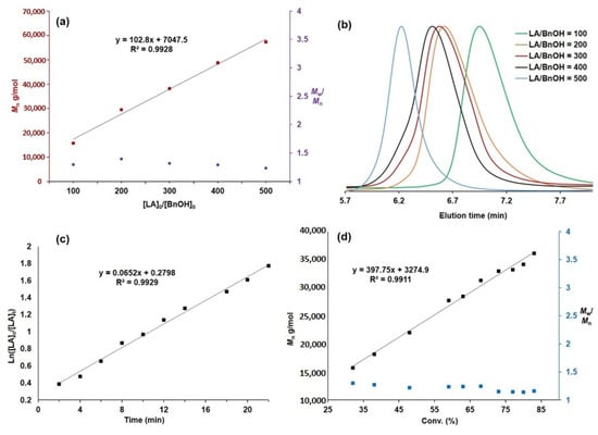 (a) Plot of PLAs: Mn(GPC) and dispersity (Mw/Mn) vs. the molar ratio of monomer to initiator ([LA]0/[BnOH]0) for the polymerization of rac-LA (run 1, 7–9, and 13, Table 1). (b) GPC traces of the polylactide prepared at different monomer ratios (run 1, 7–9, and 13, Table 1). (c) Semilogarithmic plots of ln([LA]0/[LA]t) vs. time for rac-LA polymerization (run 8, Table 1). (d) Mn (GPC) and dispersity (Ð) vs. monomer conversion for PLAs synthesized at room temperature (run 8, Table 1).