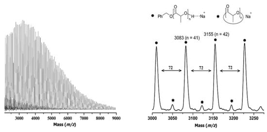 The MALDI-TOF study was conducted to determine the end group of the polymer chain and transesterification. As shown in Figure 3, the main series of peaks corresponded to 108 + 23 + 72 × n, which showed linear growth of the monomer units with benzyl alcohol as the initiator. In addition, evidence of a small amount of cyclization product was also detected by MALDI-TOF mass analysis. The regular m/z = 72 difference between the peaks indicated that significant transesterification took place during the polymerization process, which is consistent with TBD []. However, in some cases, transesterification could be used as well. For instance, Hong and coworkers reported a novel transesterification (TEster) strategy to synthesize poly(glycolic acid-co-BL) [,]. Another significant application of transesterification is the depolymerization reaction, in which the polyesters are degraded into ester with alcohol to achieve effective recycling of the polymer [,].