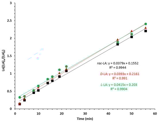 Semilogarithmic plot of ln([LA]0/[LA]t) vs. time for D-LA, L-LA, and rac-LA polymerization Table S2).