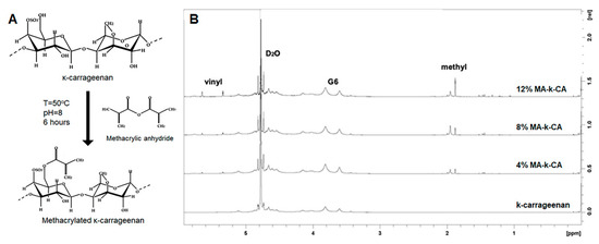 Schematic representation of the synthesis of MA-κ-CA and 1H Nuclear Magnetic Resonance (NMR) spectra of κ-CA and MA-κ-CA (4, 8 and 12%). (A) Chemical modification of MA-κ-CA and (B) 1H NMR spectra of κ-CA and MA-κ-CA recorded in deuterium oxide (D2O). The vinyl group peak was located at chemical shift (δ) = 5.3–5.8 ppm and methyl group peak at δ = 1.8–2 ppm. The D2O peak was located at δ = 4.6–4.8 ppm and β-galactose subunit of κ-CA (G6) were found around δ = 3.5–3.9 ppm.