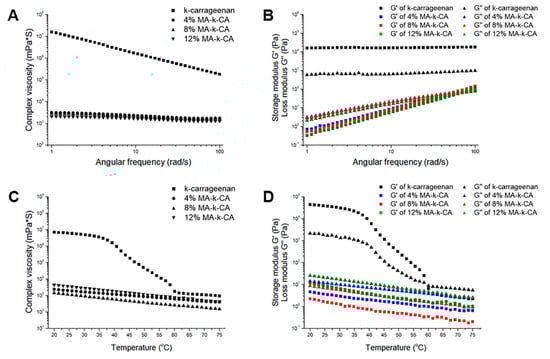 Angular frequency and temperature dependent rheological properties. Rheological properties of the κ-CA and MA-κ-CA (4, 8 and 12%) prepolymer solution at printing temperature (25 °C). (A) Complex viscosity (B) Storage modulus (G′) and Loss modulus (G″). Temperature dependent rheological properties of the κ-CA and 4, 8 and 12% MA-κ-CA prepolymer. (C) Complex viscosity (D) Storage modulus (G′) and loss modulus (G″).