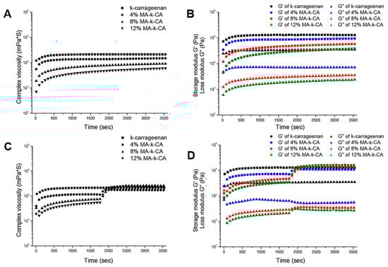Ionic and UV crosslinking dependent rheological properties. Rheological properties of κ-CA and 4, 8 and 12% MA-κ-CA hydrogel during ionic crosslinking for 1 h (3600 s) (A) Complex viscosity (B) Storage modulus (G′) and Loss modulus (G″). Rheological properties of κ-CA and 4%, 8%, 12% MA-κ-CA hydrogel during ionic and UV crosslinking for 1 h (3600 s) (C) Complex viscosity (D) Storage modulus (G′) and Loss modulus (G″).